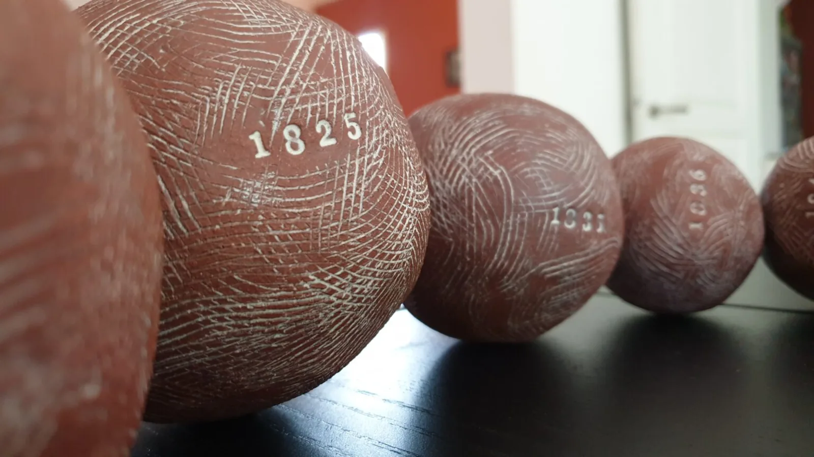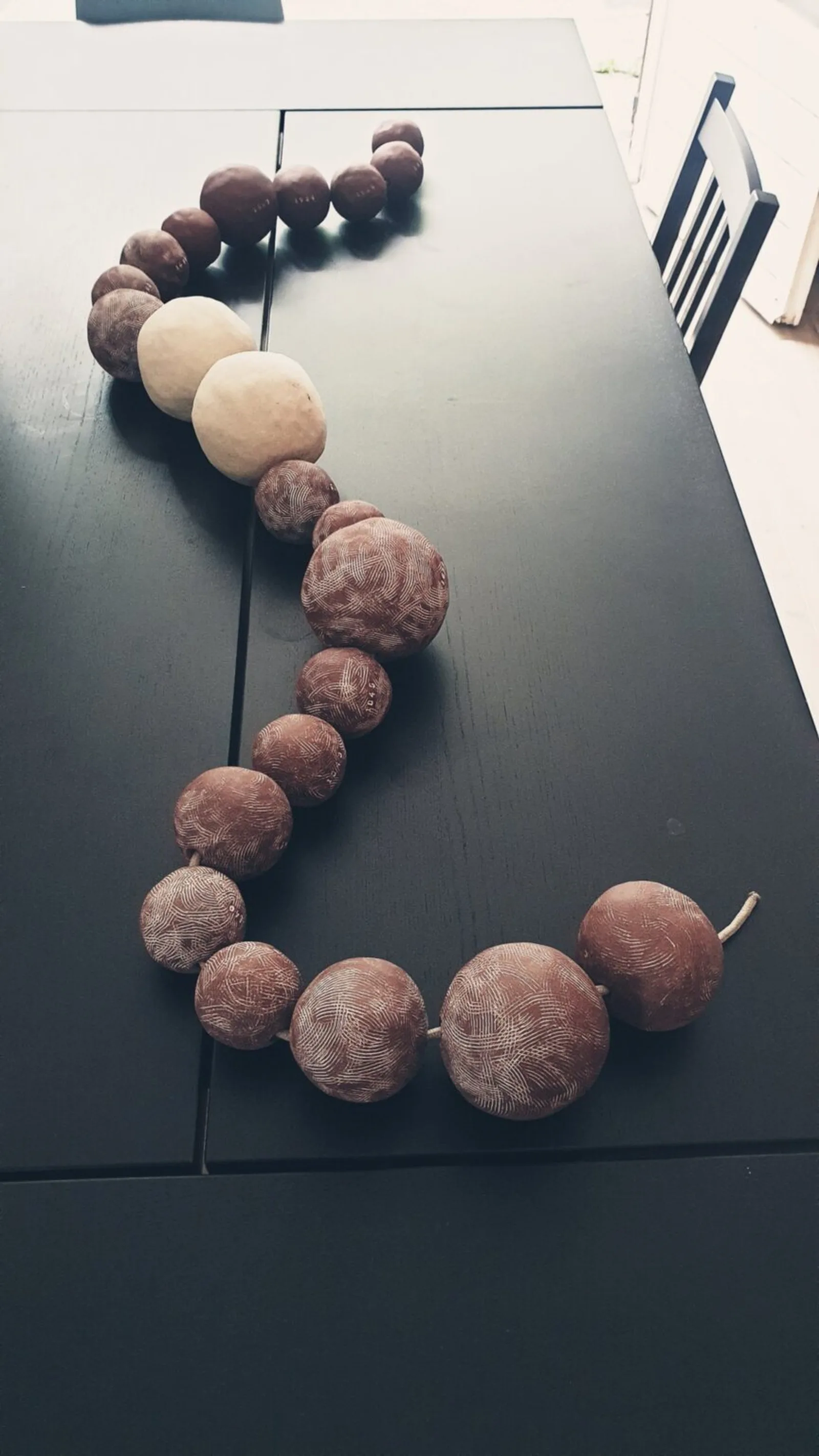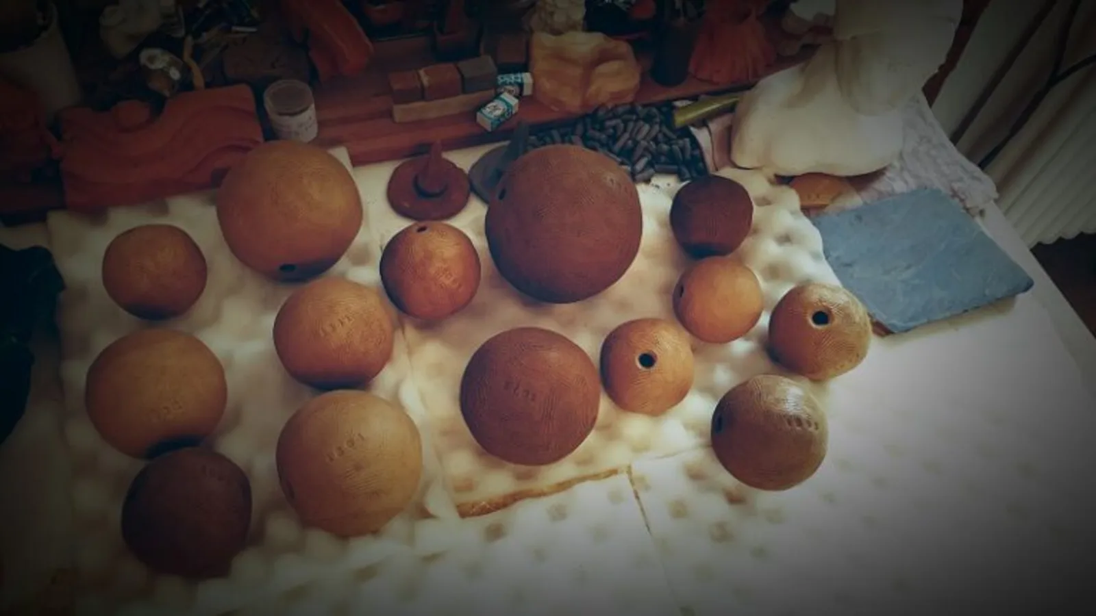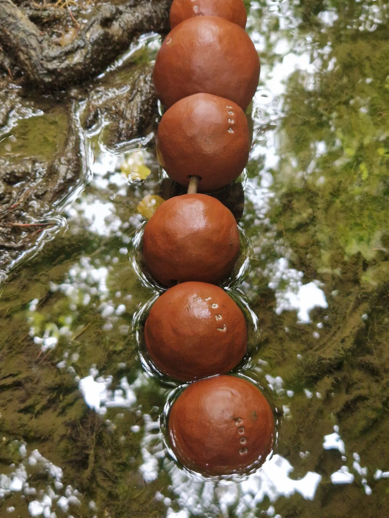 A ceramic datasculpture made from Loire Valley clay, where each sphere represents a recorded flood of the Loire River in Orléans between 1800 and 2003.