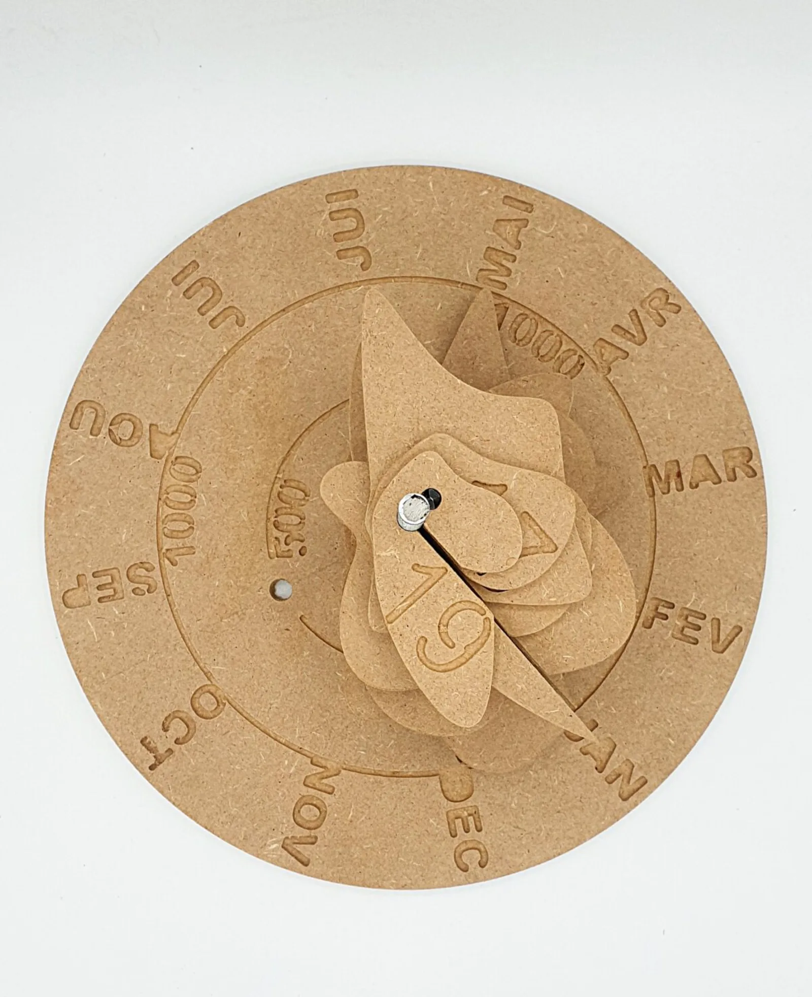 A wooden datasculpture representing monthly water height data of the Loire River in Orléans from 2000 to 2022, each disc symbolizing a year in the river’s changing flow.