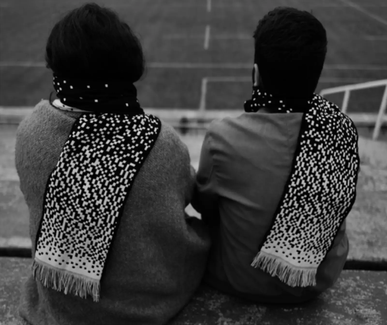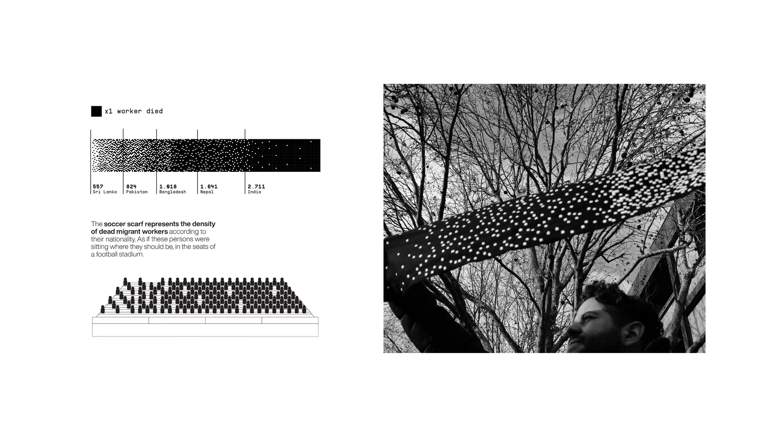 The project tells the story of absent fans, represented as if they were seated in the stands of a football stadium. Each mark on the scarf stands for a life lost — workers who built the very venues they would never attend.