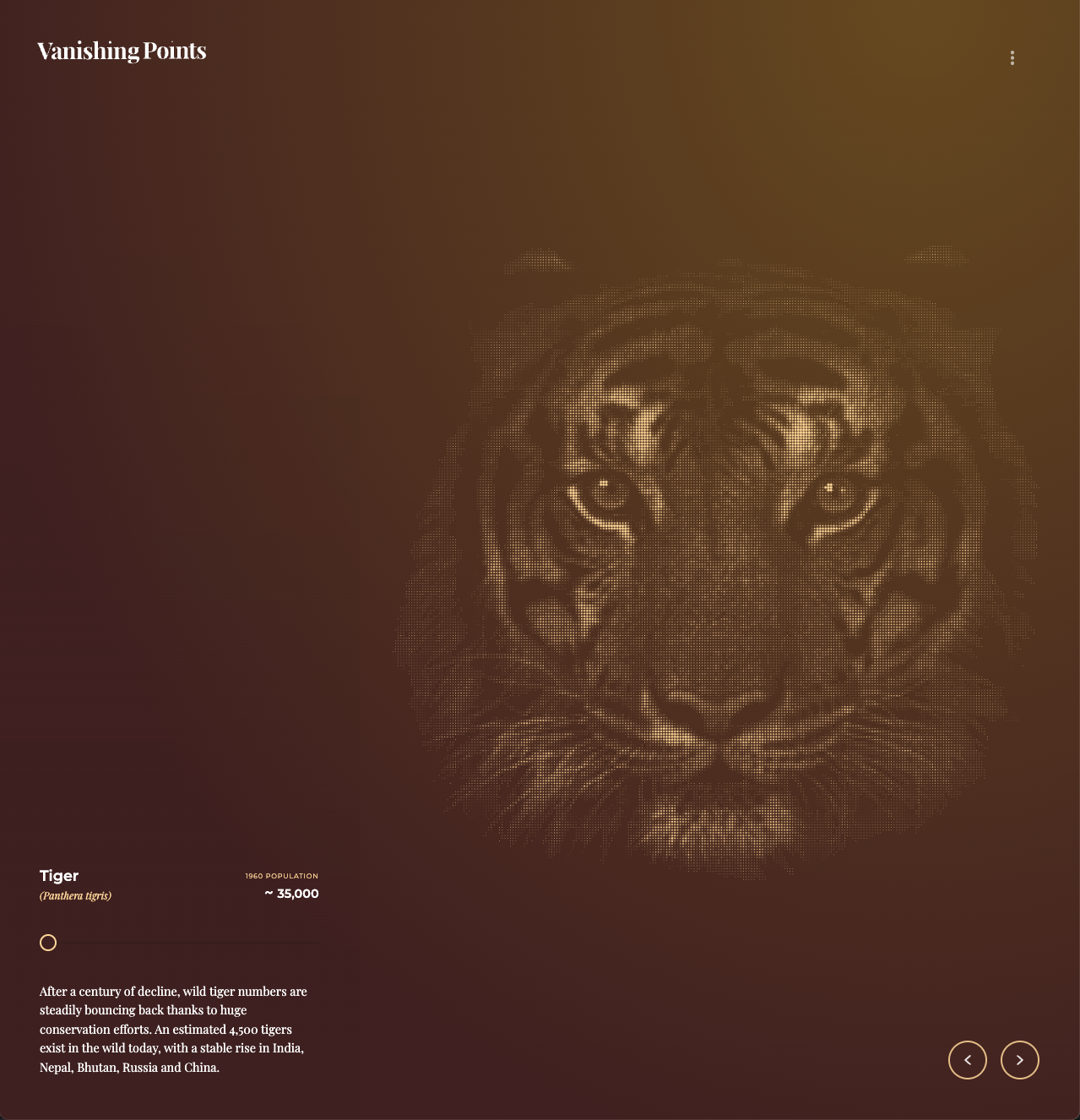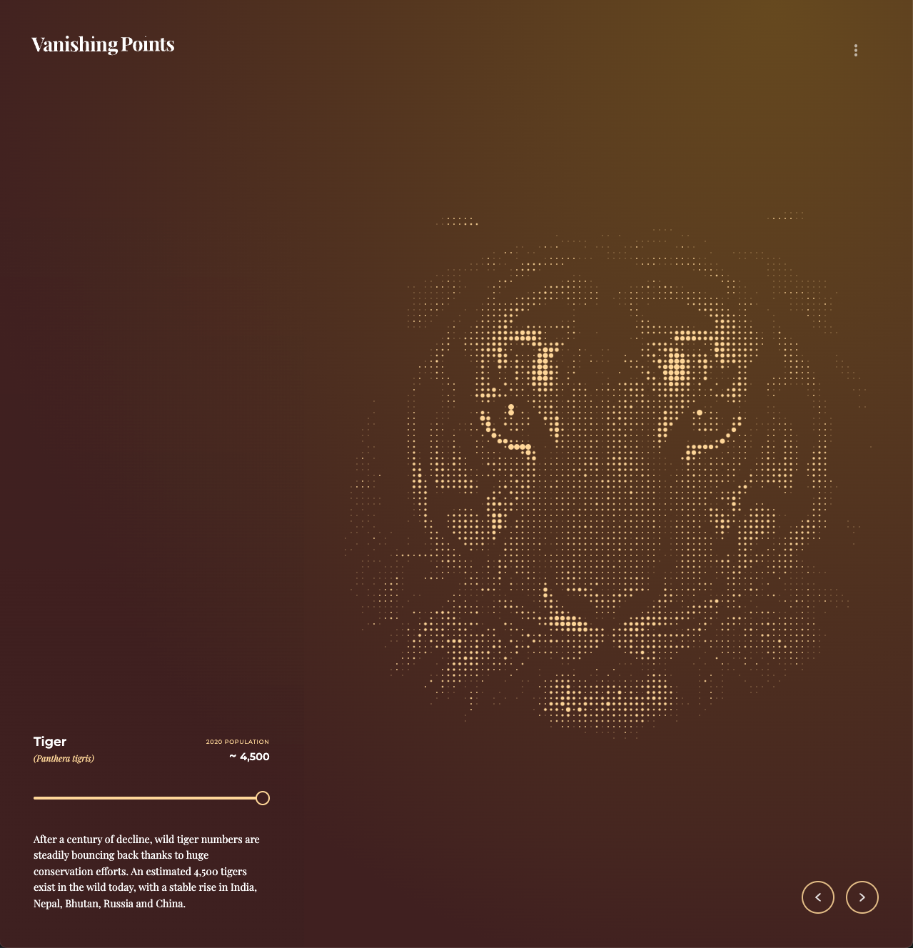 Each animal comes with a slider that shows the evolution of its population over time. For example, the Tiger gradually disappears between 1960 and 2020.