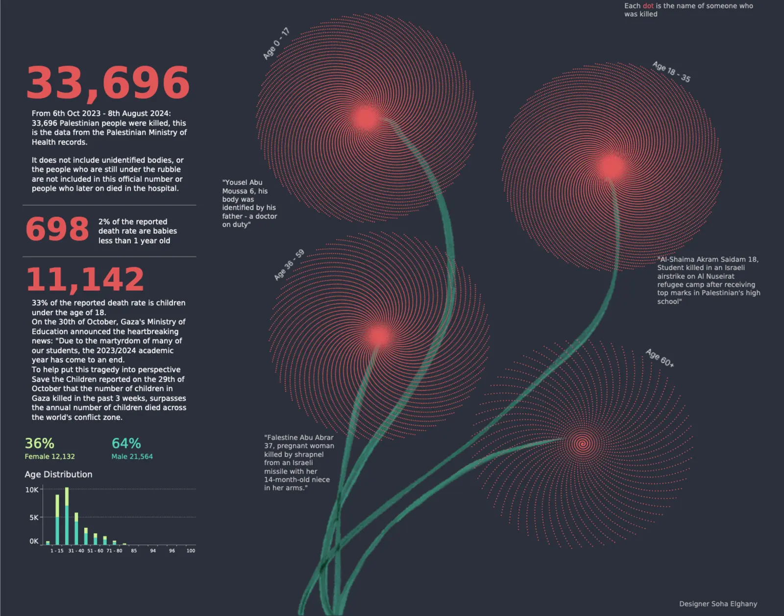 Soha’s solution was disaggregation: each dot represents an individual, with hover revealing name, age, and gender. The poppy motif, a national symbol, marks the data visually, emphasising children’s deaths and highlighting age brackets.