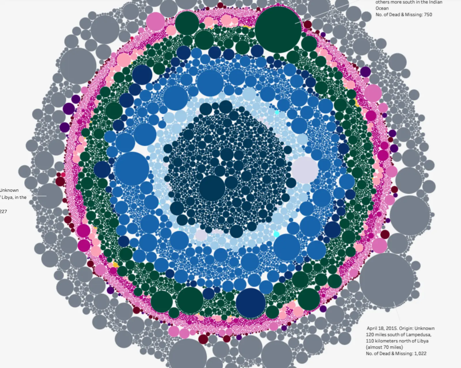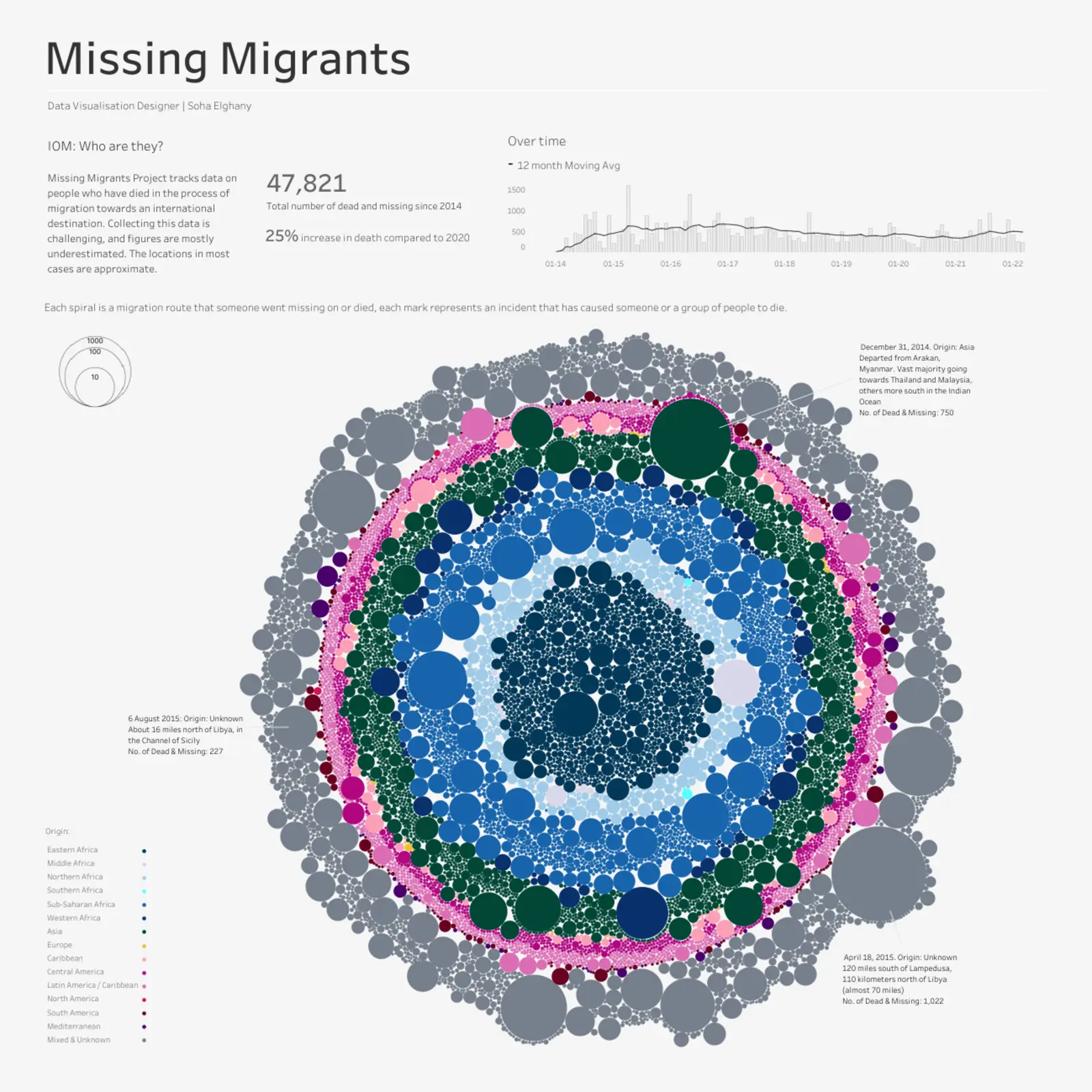 The Missing Migrants Project tracks people who died or went missing during migration toward international destinations. Each spiral represents a migration route, and each mark along it corresponds to an individual incident.